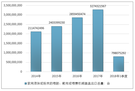 2016年我国家用液体或粉末的喷射、散布或喷雾机械器具出口总量2859450474台,2017年出口总量3274321567台;2019年1季度出口总量798075292台。