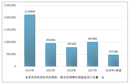 2016年我国家用液体或粉末的喷射、散布或喷雾机械器具进口总量787293台,2017年进口总量997900台;2019年1季度进口总量477180台。