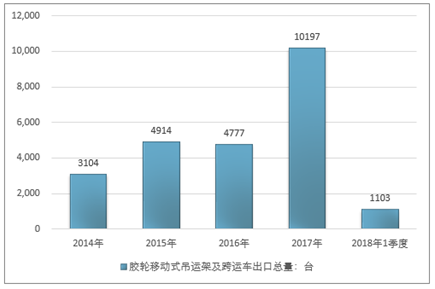 2016年我国胶轮移动式吊运架及跨运车出口总量4777台,2017年出口总量10197台;2019年1季度出口总量1103台。