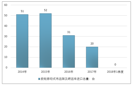 2016年我国胶轮移动式吊运架及跨运车进口总量31台,2017年进口总量20台;2019年1季度进口总量-台。