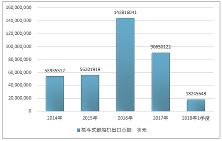 2016年我国抓斗式卸船机出口总额143816041美元,2017年出口总额90650122美元;2019年1季度出口总额18245648美元。