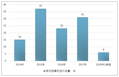 2016年我国塔式起重机进口总量23台,2017年进口总量31台;2019年1季度进口总量6台。