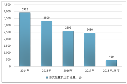 2016年我国塔式起重机出口总量2602台,2017年出口总量2450台;2019年1季度出口总量469台。