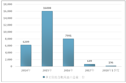 2016年我国单工位组合机床出口总量7991台 ,2017年出口总量649台 ;2019年1季度出口总量196台 。