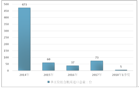 2016年我国单工位组合机床进口总量37台 ,2017年进口总量73台 ;2019年1季度进口总量5台 。
