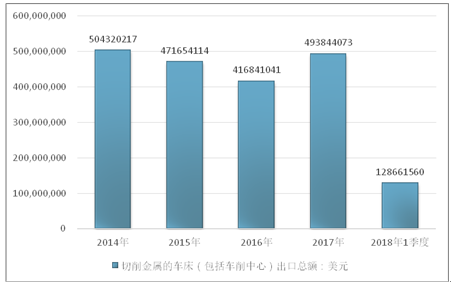 2016年我国切削金属的车床(包括车削中心)出口总额416841041美元,2017年出口总额493844073美元;2019年1季度出口总额128661560美元。