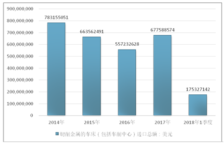 2016年我国切削金属的车床(包括车削中心)进口总额557232628美元,2017年进口总额677588574美元;2019年1季度进口总额175327142美元。