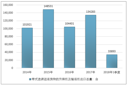 2016年我国带式连续运送货物的升降机及输送机出口总量104401台,2017年出口总量134283台;2019年1季度出口总量33893台。