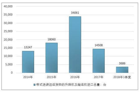 2016年我国带式连续运送货物的升降机及输送机进口总量34061台,2017年进口总量14508台;2019年1季度进口总量3686台。