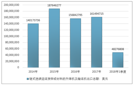2016年我国链式连续运送货物或材料的升降机及输送机出口总额156842795美元,2017年出口总额161494715美元;2019年1季度出口总额48276808美元。