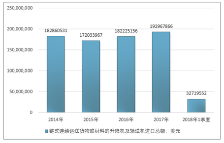 2016年我国链式连续运送货物或材料的升降机及输送机进口总额182225156美元,2017年进口总额192967866美元;2019年1季度进口总额32719552美元。