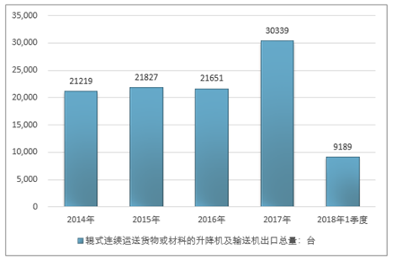 2016年我国辊式连续运送货物或材料的升降机及输送机出口总量21651台,2017年出口总量30339台;2019年1季度出口总量9189台。