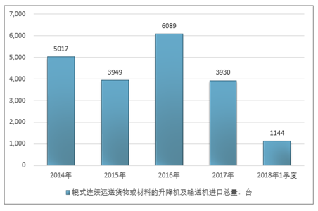 2016年我国辊式连续运送货物或材料的升降机及输送机进口总量6089台,2017年进口总量3930台;2019年1季度进口总量1144台。