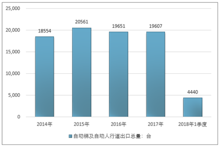 2016年我国自动梯及自动人行道出口总量19651台 ,2017年出口总量19607台 ;2019年1季度出口总量4440台 。