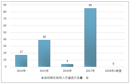 2016年我国自动梯及自动人行道进口总量4台 ,2017年进口总量85台 ;2019年1季度进口总量-台 。