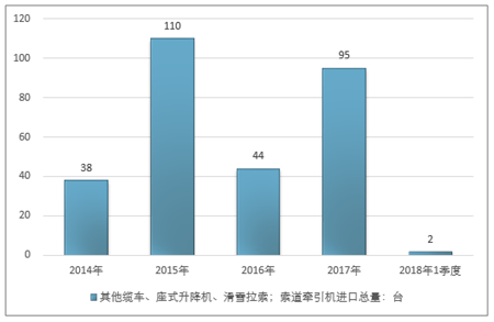 2016年我国其他缆车、座式升降机、滑雪拉索;索道牵引机进口总量44台 ,2017年进口总量95台 ;2019年1季度进口总量2台 。