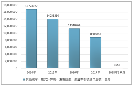 2016年我国其他缆车、座式升降机、滑雪拉索;索道牵引机进口总额11310764美元,2017年进口总额8806861美元;2019年1季度进口总额3658美元。