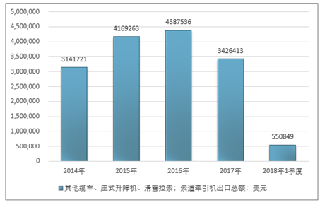 2016年我国其他缆车、座式升降机、滑雪拉索;索道牵引机出口总额4387536美元,2017年出口总额3426413美元;2019年1季度出口总额550849美元。