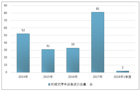 2016年我国机械式停车设备进口总量33台 ,2017年进口总量81台 ;2019年1季度进口总量2台 。