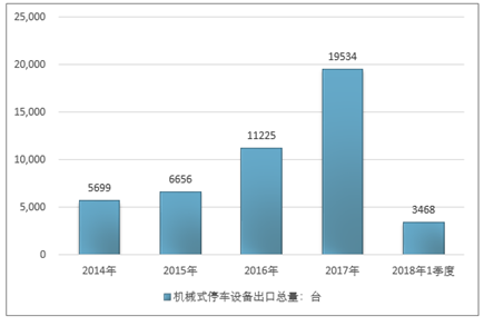 2016年我国机械式停车设备出口总量11225台 ,2017年出口总量19534台 ;2019年1季度出口总量3468台 。