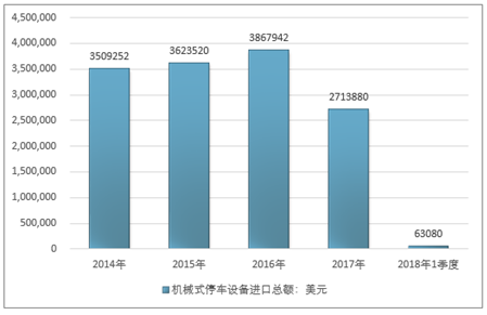 2016年我国机械式停车设备进口总额3867942美元,2017年进口总额2713880美元;2019年1季度进口总额63080美元。