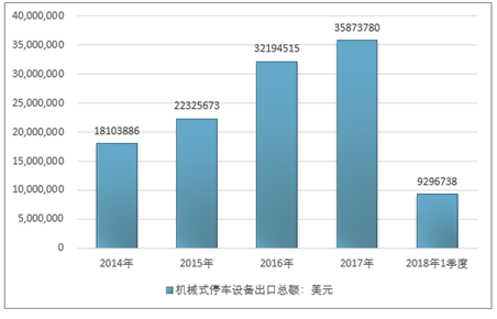 2016年我国机械式停车设备出口总额32194515美元,2017年出口总额35873780美元;2019年1季度出口总额9296738美元。