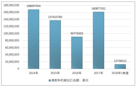 2016年我国堆取料机械出口总额90770305美元,2017年出口总额160877331美元;2019年1季度出口总额12738322美元。