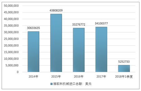 2016年我国堆取料机械进口总额33276772美元,2017年进口总额34100377美元;2019年1季度进口总额5252733美元。