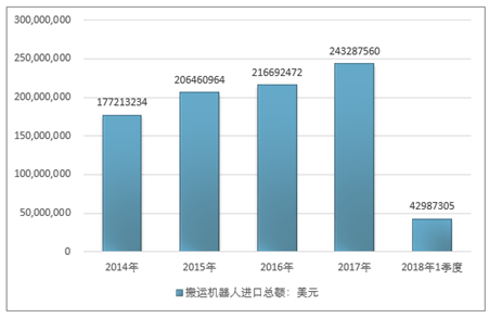 2016年我国搬运机器人进口总额216692472美元,2017年进口总额243287560美元;2019年1季度进口总额42987305美元。