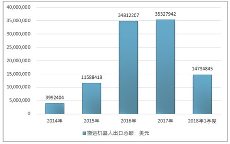 2016年我国搬运机器人出口总额34812207美元,2017年出口总额35327942美元;2019年1季度出口总额14734845美元。