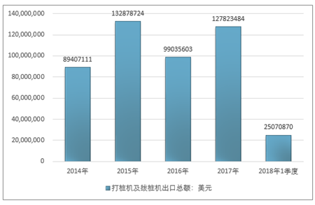 2016年我国打桩机及拔桩机出口总额99035603美元,2017年出口总额127823484美元;2019年1季度出口总额25070870美元。