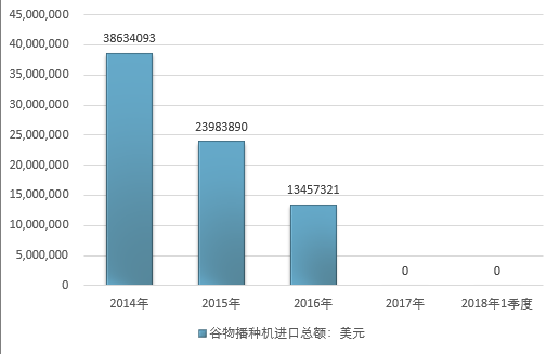 2016年我国谷物播种机进口总额13457321美元,2017年进口总额-美元;2019年1季度进口总额-美元。
