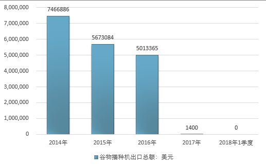 2016年我国谷物播种机出口总额5013365美元,2017年出口总额1400美元;2019年1季度出口总额-美元。