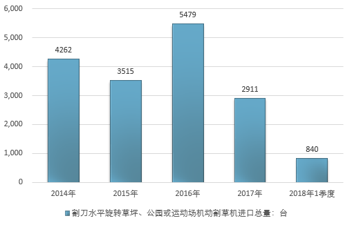 2016年我国割刀水平旋转草坪、公园或运动场机动割草机进口总量5479台,2017年进口总量2911台;2019年1季度进口总量840台。