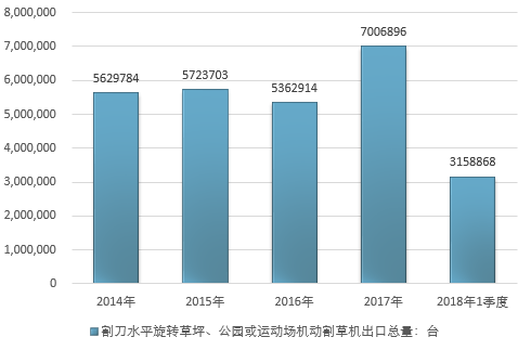 2016年我国割刀水平旋转草坪、公园或运动场机动割草机出口总量5362914台,2017年出口总量7006896台;2019年1季度出口总量3158868台。