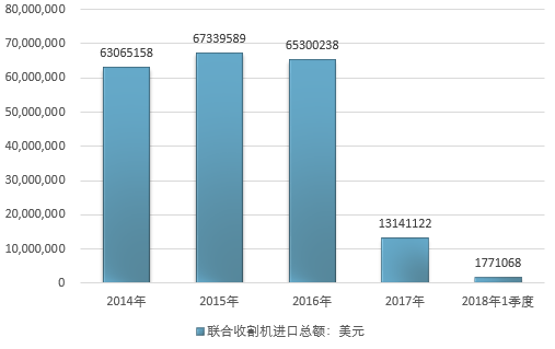 2016年我国联合收割机进口总额65300238美元,2017年进口总额13141122美元;2019年1季度进口总额1771068美元。