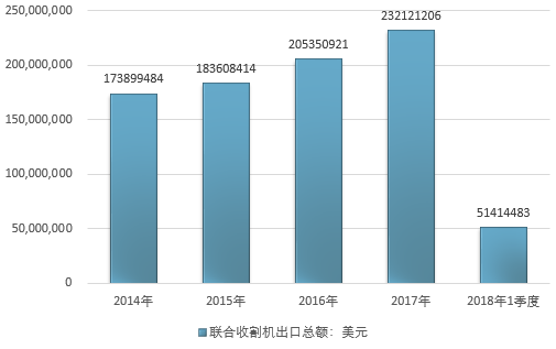 2016年我国联合收割机出口总额205350921美元,2017年出口总额232121206美元;2019年1季度出口总额51414483美元。
