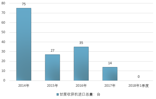 2016年我国甘蔗收获机进口总量35台 ,2017年进口总量14台 ;2019年1季度进口总量-台 。