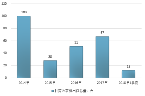 2016年我国甘蔗收获机出口总量51台 ,2017年出口总量67台 ;2019年1季度出口总量12台 。