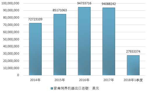 2016年我国家禽饲养机器出口总额94733716美元,2017年出口总额94088242美元;2019年1季度出口总额27933374美元。