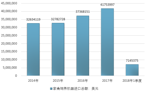 2016年我国家禽饲养机器进口总额37368151美元,2017年进口总额41753997美元;2019年1季度进口总额7145375美元。