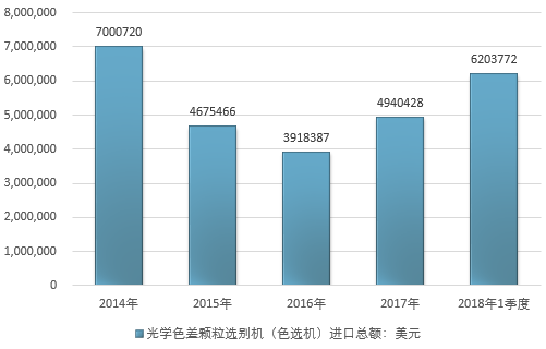 2016年我国光学色差颗粒选别机(色选机)进口总额3918387美元,2017年进口总额4940428美元;2019年1季度进口总额6203772美元。