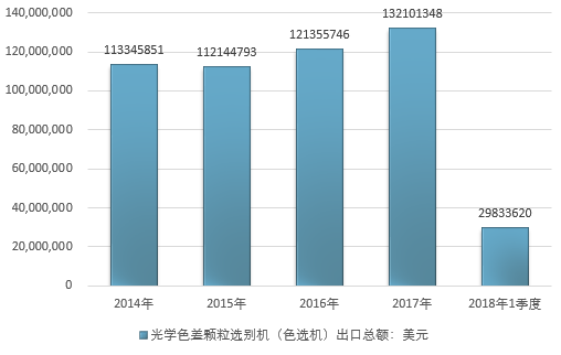 2016年我国光学色差颗粒选别机(色选机)出口总额121355746美元,2017年出口总额132101348美元;2019年1季度出口总额29833620美元。