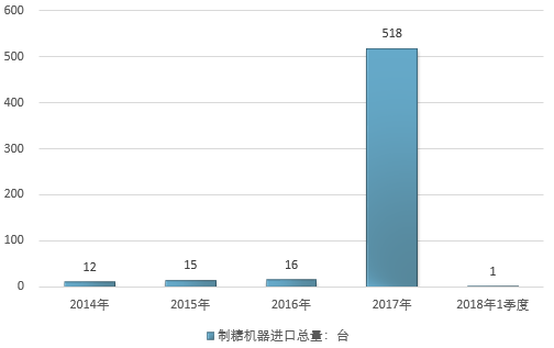 2016年我国制糖机器进口总量16台 ,2017年进口总量518台 ;2019年1季度进口总量1台 。