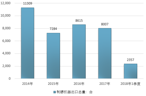 2016年我国制糖机器出口总量8615台 ,2017年出口总量8007台 ;2019年1季度出口总量2357台 。