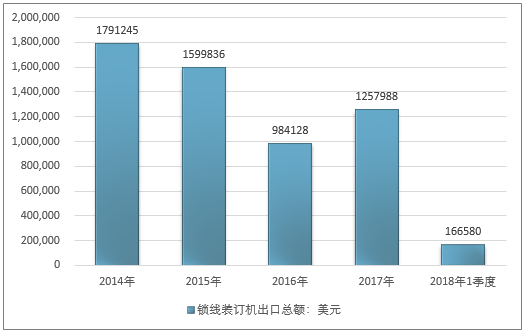 2016年我国锁线装订机出口总额984128美元,2017年出口总额1257988美元;2019年1季度出口总额166580美元。