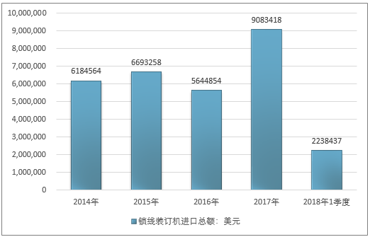 2016年我国锁线装订机进口总额5644854美元,2017年进口总额9083418美元;2019年1季度进口总额2238437美元。