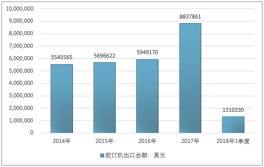 2016年我国胶订机出口总额5949170美元,2017年出口总额8837861美元;2019年1季度出口总额1310330美元。