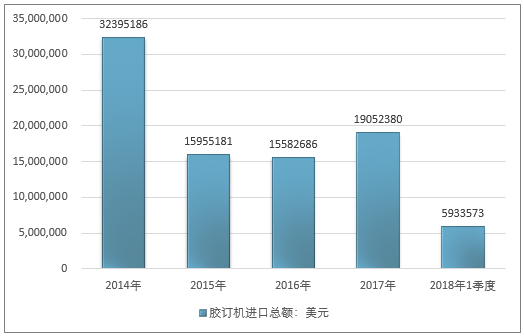 2016年我国胶订机进口总额15582686美元,2017年进口总额19052380美元;2019年1季度进口总额5933573美元。