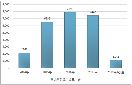 2016年我国切纸机进口总量7896台 ,2017年进口总量7443台 ;2019年1季度进口总量1142台 。